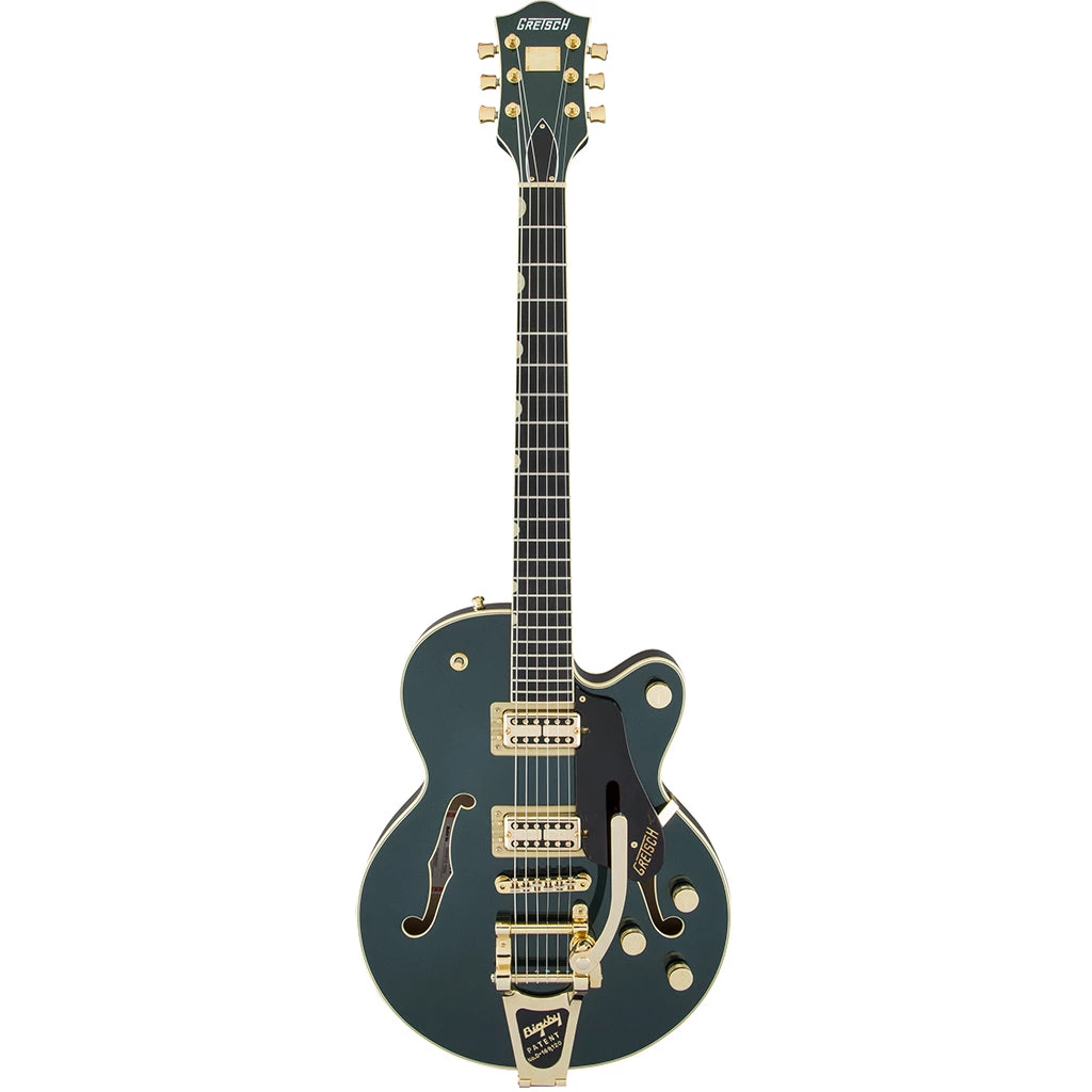 The G6659TG is available in a pair of classic Gretsch finishes — Cadillac Green or Vintage White, and decked out with a matching headstock, tortoise pickguard and gleaming gold hardware.