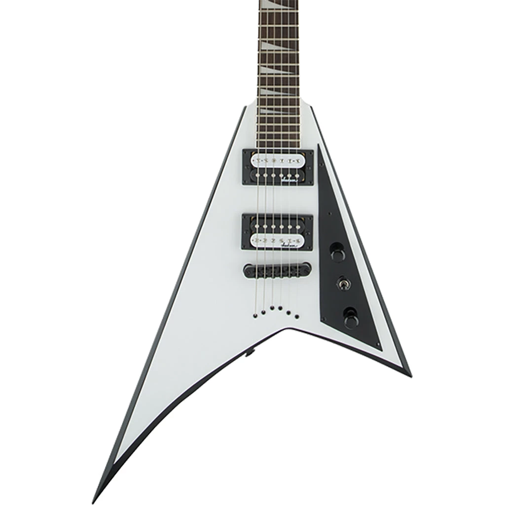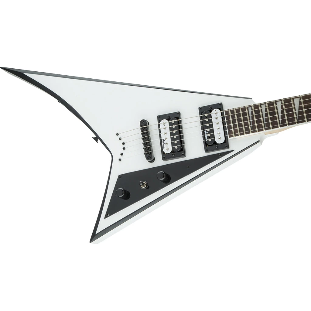 The JS Series Rhoads JS32T has a poplar body and a bolt-on maple speed neck with graphite reinforcement and scarf joint for rock-solid stability. Hosting 24 jumbo frets and pearloid sharkfin inlays, the 12”-16” compound radius fully bound amaranth fingerboard creates the ideal playing surface for fat riffs and easy chording near the black plastic nut while gradually flattening in the upper registers for lightning-quick solos and wide bends without fear of fretting out.