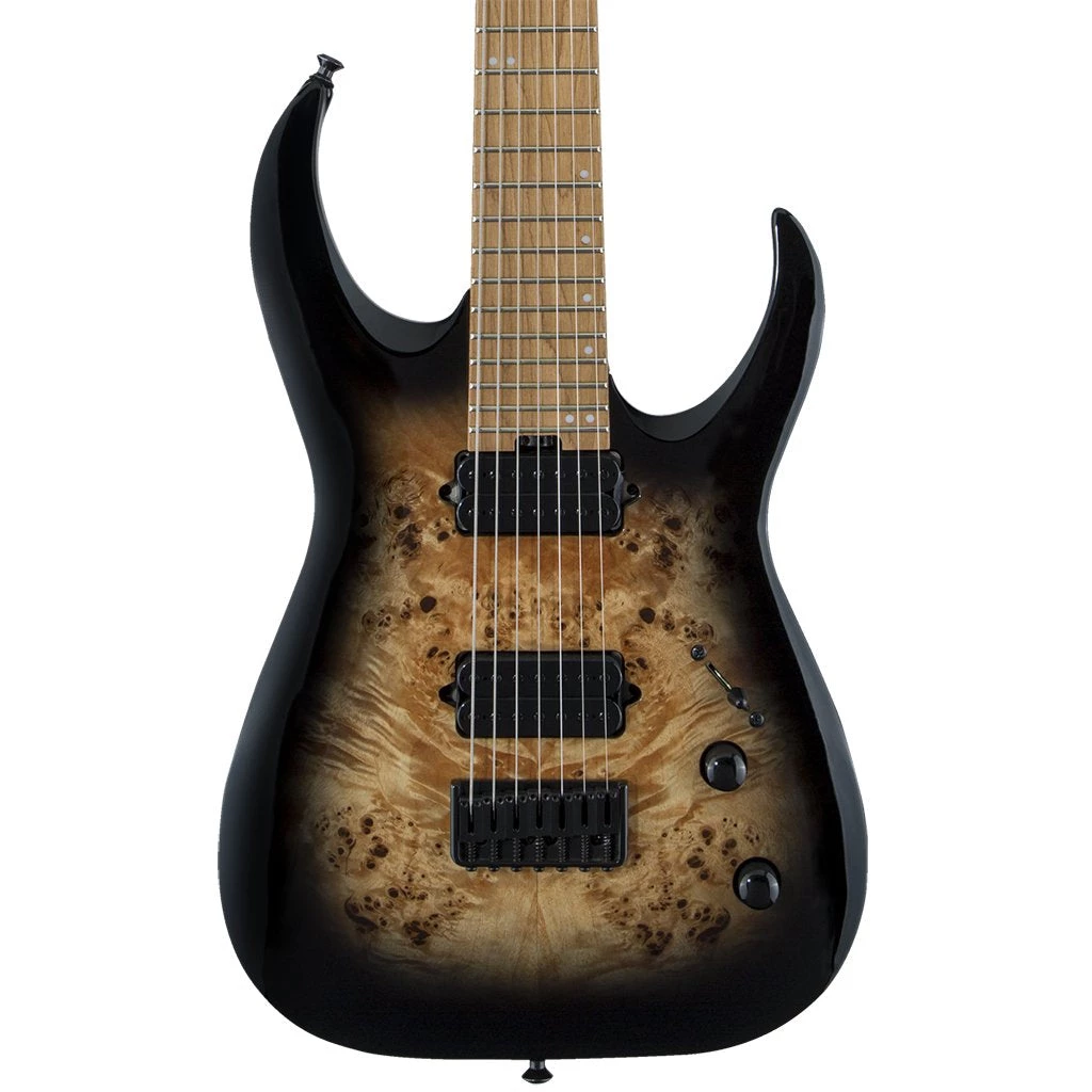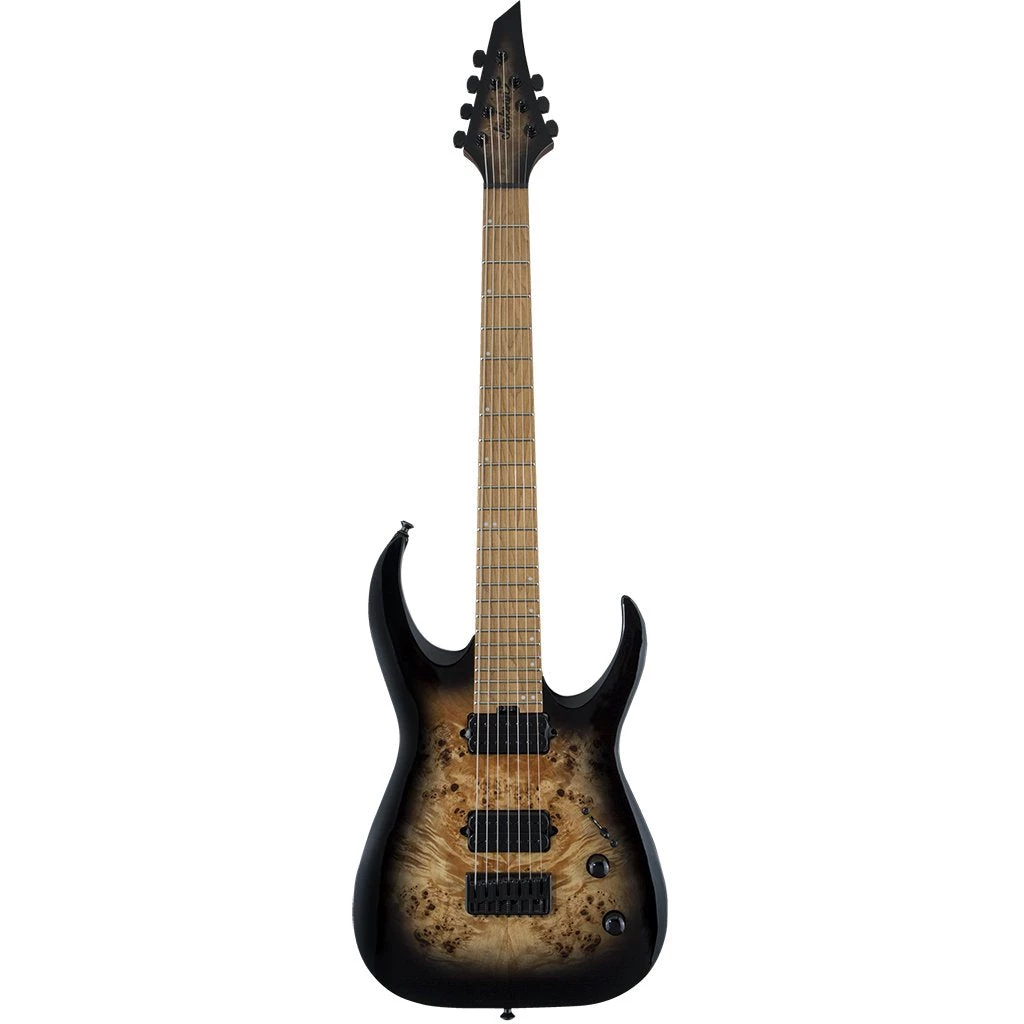 This 7-string leviathan is available in an all-new sophisticated Black Burst Burl finish with a matching Jackson 4×3 AT-1 headstock and black hardware.