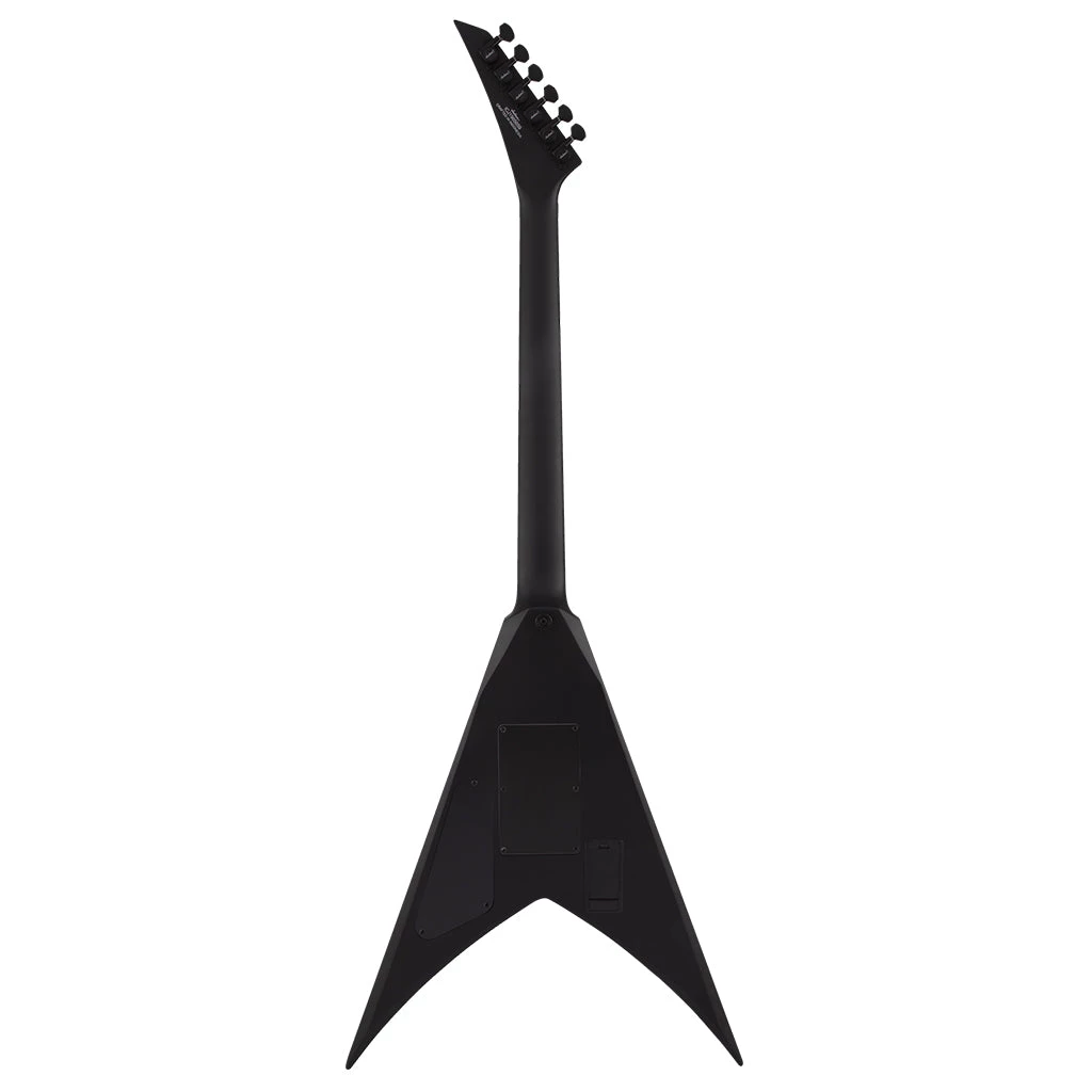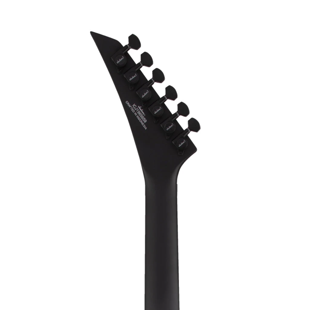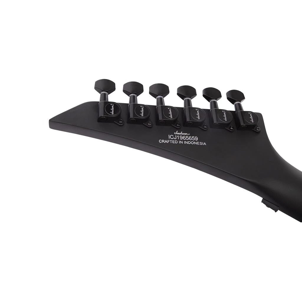Cloaked in either Satin Black or Slime Green with Black Bevels, this royal axe is finished off with a Jackson pointed 6-in-line black headstock and black hardware.