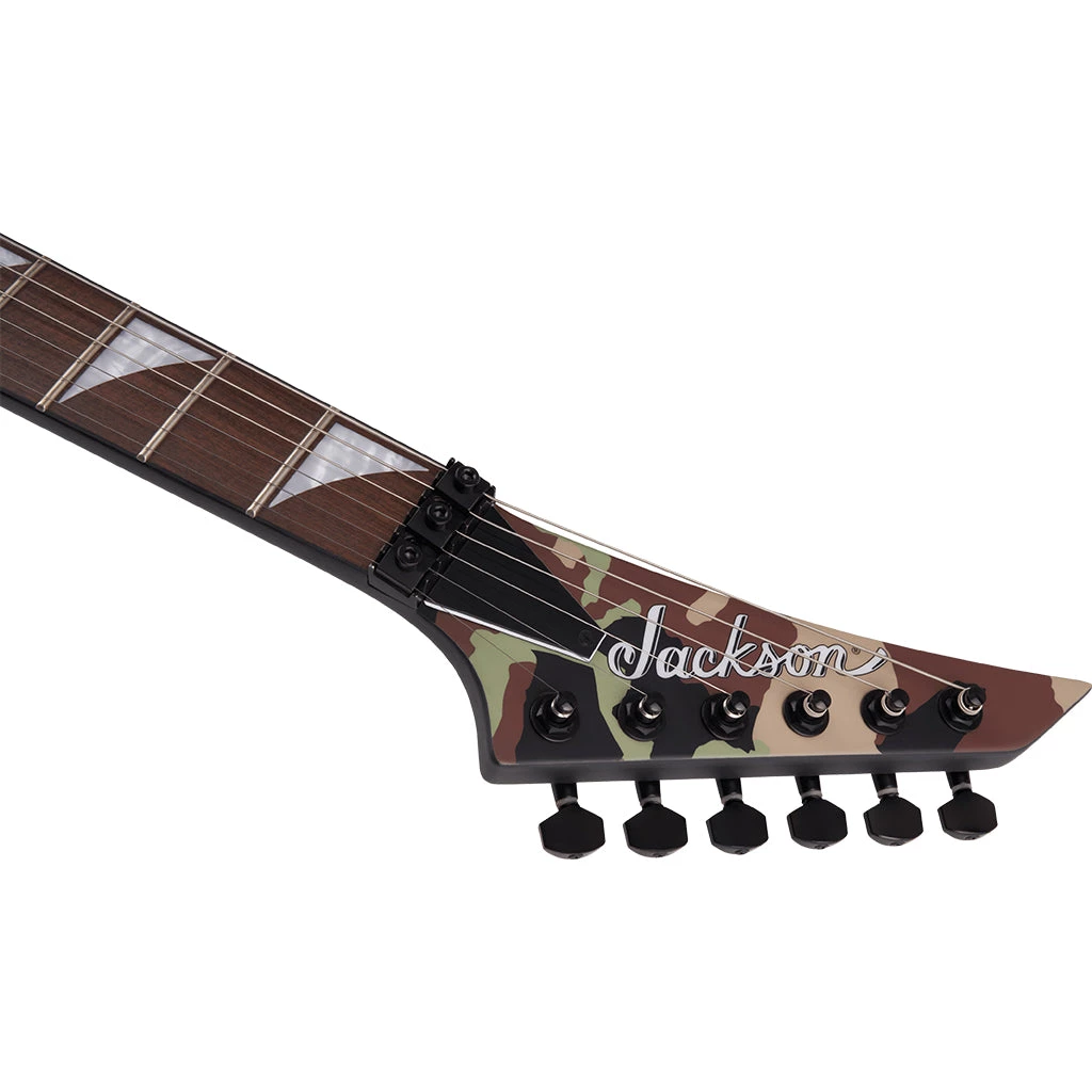 Jackson® X Series Rhoads models continue the metal legacy pioneered by the immortal Randy Rhoads. Regal and proud, the all-new Jackson X Series Rhoads RRX24 Camo offers fantastic tone, ultra-fast playability and unbelievable value for 21st century guitarists. The RRX24 features a poplar body and through-body maple neck with graphite reinforcement to guard against climate-induced warping and scarf joint for reduced playing fatigue. Hosting 24 jumbo frets and pearloid sharkfin inlays, the 12”-16” compound radius bound laurel fingerboard has a more rounded profile at the nut for natural-feeling chording and riffing and gradually flattens towards the heel for optimal shred articulation and bends. Engineered for the modern metaller, active Jackson covered high-output humbucking pickups deliver searing and dynamic tone loaded with crunch for brazen lead work or assertive rhythms runs. This instrument’s expansive voice can be tailored by a three-way pickup blade switch, two volume knobs and a single tone control. The RRX24 is also equipped with a recessed Floyd Rose® Special double-locking tremolo system for reliable tuning stability that can withstand aggressive dive bombs, harmonic squeals or flutters. Despite its camouflage finishes, the Jackson X Series Rhoads RRX24 Camo is sure to command attention in Black Camo or Woodland Camo with a matching camo reverse pointy headstock and black hardware.