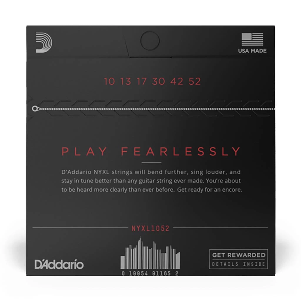 NYXL1052 offers powerful low end for heavy chording and flexible plain steel strings for bending. The high carbon steel used in NYXL strings offers higher break strength, enhanced tuning stability, and accentuated mid-range frequency response.