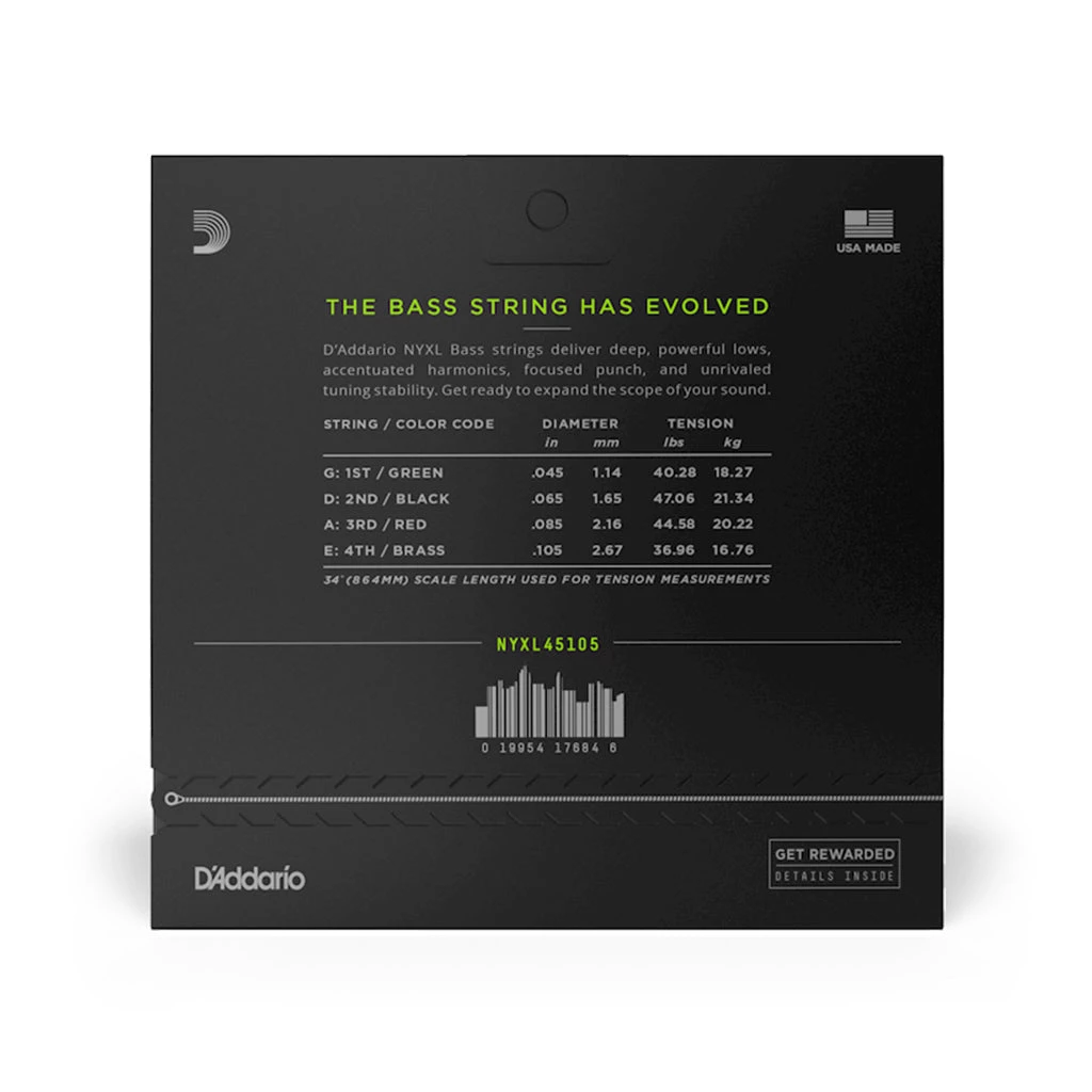 NYXL45105 is a hybrid gauge string set for long scale basses. The high carbon steel used in NYXL strings offers higher break strength, enhanced tuning stability, and accentuated mid-range.