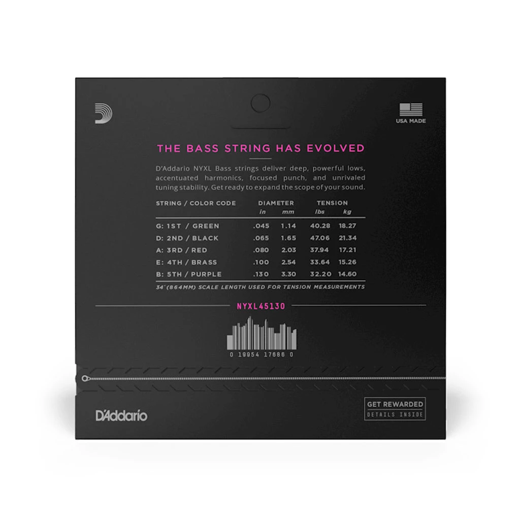NYXL45130 is a regular light gauge string set for 5-String, long scale basses. The high carbon steel used in NYXL strings offers higher break strength, enhanced tuning stability, and accentuated mid-range