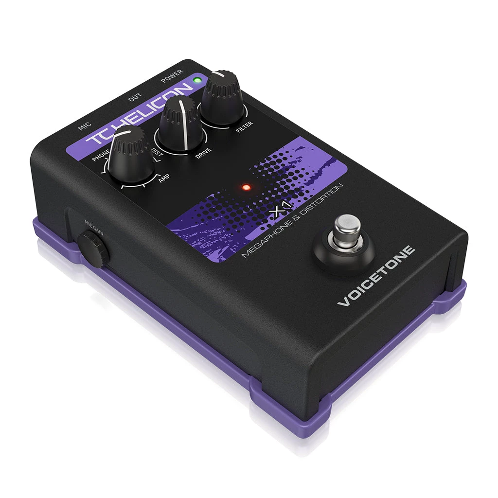 Single-button vocal stompbox with megaphone and distortion filter effects for an extreme sound
