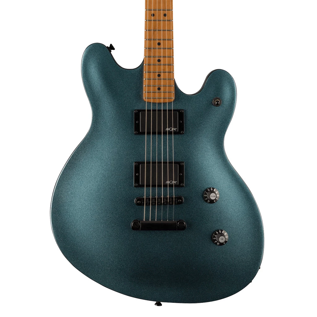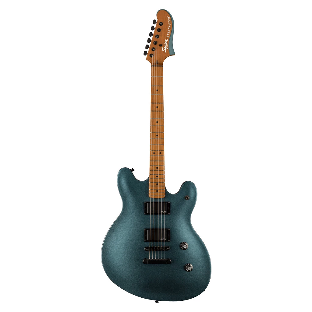 The Starcaster broke the mold of semi-hollow guitar design with its offset body shape when it was introduced in the ‘70s, offering versatile sounds and out-of-this-world styling for the most adventurous players. The Squier® Contemporary Active Starcaster® is an evolution of the original Fender model, engineered with a sealed semi-hollow body for minimized feedback and powered by dual Squier SQR™ active ceramic humbucking pickups for massive high-output signal. The roasted maple neck was chosen for its optimal tone and stability, and a sculpted heel design allows for improved access all the way to the 22nd fret. High-performance components round out the feature list and include a fully adjustable bridge with stop tailpiece for rock-solid string feel, and a set of sealed-gear tuning machines with split shafts for smooth tuning action and easy restringing. Eye-catching styling cues include stealthy black chrome hardware and a sleek matching painted contoured headstock with chrome logos for a premium look.