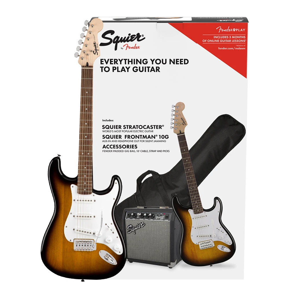 A perfect choice for beginners, the Squier Strat Pack has everything you need to begin playing right out of the box. The Stratocaster is ideal for beginning players and provides a comfortable playing feel. It includes a lightweight body, a vintage-style tremolo bridge for classic pitch effects and three single-coil pickups for classic Strat tone. We also included a free 3-month subscription to Fender Play®—the easiest way to learn guitar.