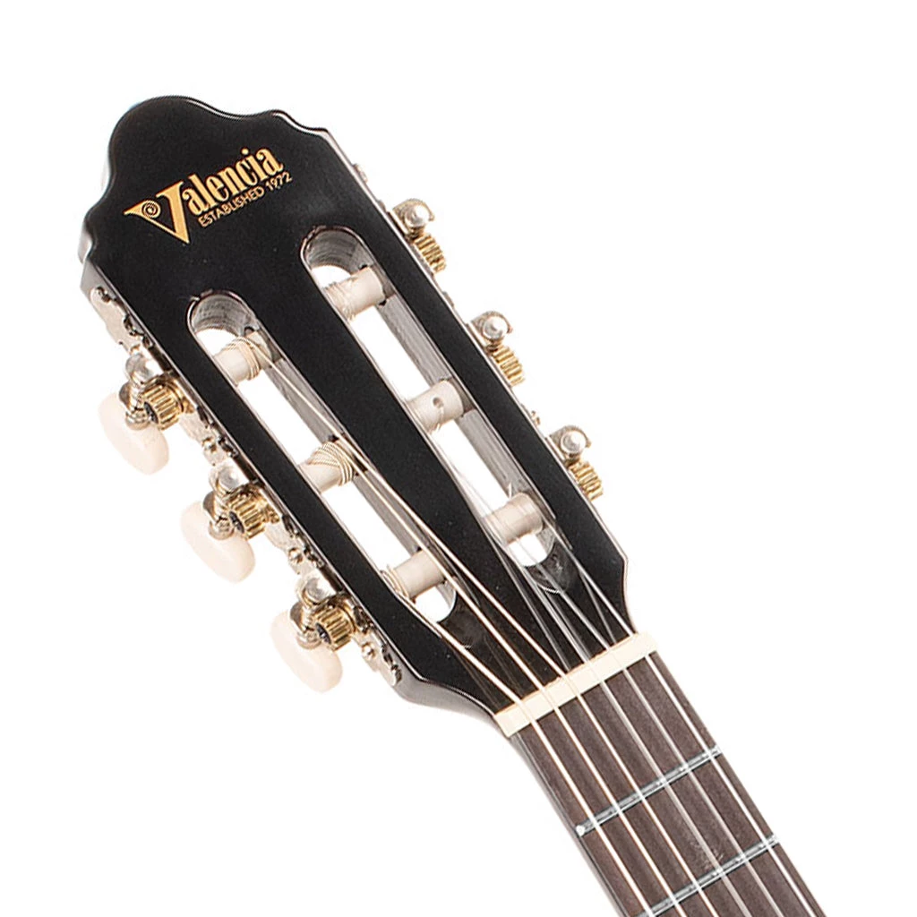 An Excellent First Nylon String Classical Guitar! The Valencia Series 100 is a fully featured, nylon string guitar that’s affordable enough for any guitarist. Its neck scale length allows you to play with true classical finger style. As a result, it is just what you need to develop proper playing technique. Whether you’re a very young player or a little older, the Series 100 range offers a wide choice of instrument sizes. This ensures a correct fit for all players.